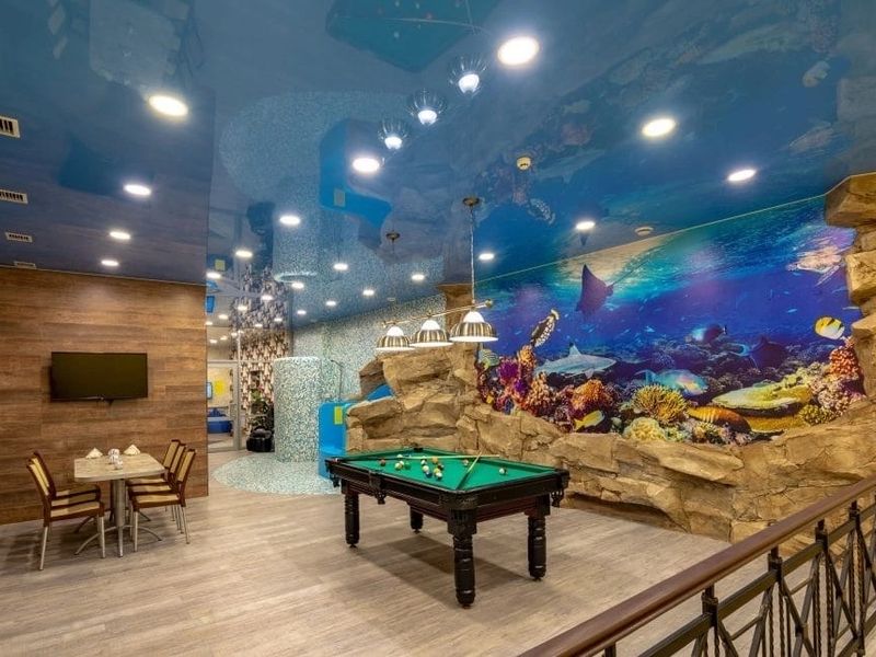 Двухэтажная сауна с горкой, бассейном, джакузи*, хаммамом, парилкой, детской игровой комнатой, аэрохоккеем, батутом, бильярдом и массажным креслом*.